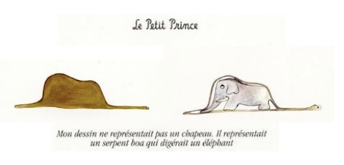 What I do remember, clearly and to this day, is the image above of an elephant being digested by a boa constrictor. (In fact, I can even read and understand the words.)